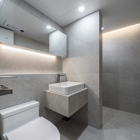 욕실 리모델링 전 모습입니다.이것도 기존에 개조해서 사용했는데 무채색이라 단조로운 느낌이 들어요.그래서 다시 아이들을 위해 새로 유광 타일로 시공했다고 합니다.